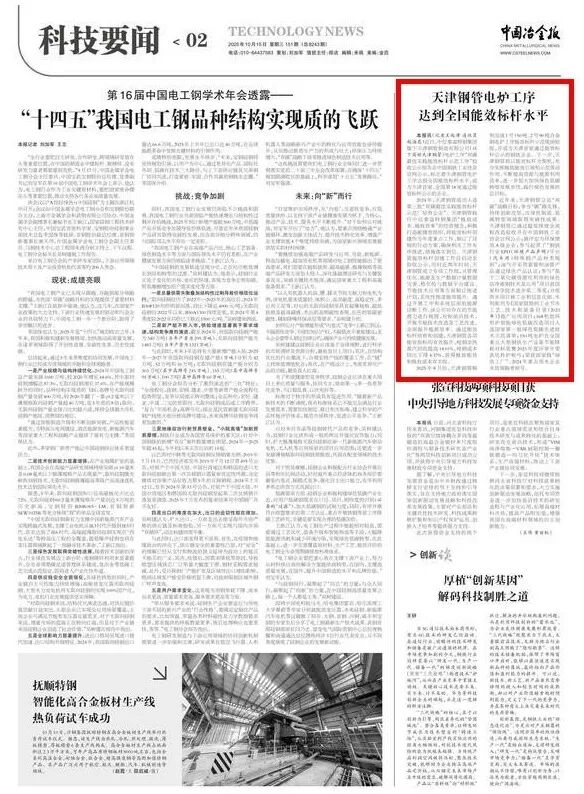 10月15日和9月27日,中国冶金报和津云客户端,分别刊发了《天津钢管电炉工序达到全国能效标杆水平》《天津钢管电炉工序能效标杆通过中钢协验收公示系天津首家》的报道,现将报道转发如下。